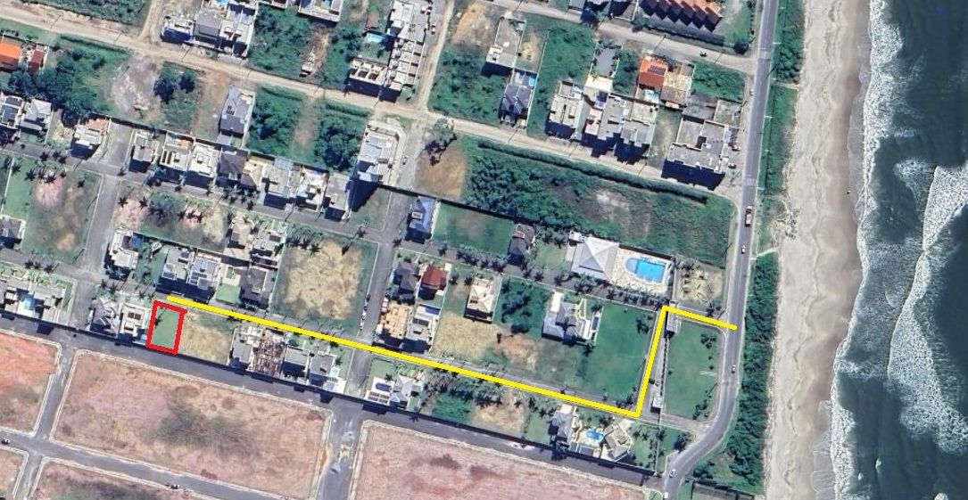 Lote situado a 250m da praia, na 2a quadra (vide figura). Trecho da praia com iluminação publica e acesso fácil para pedestres. Condomínio localizado na parte Norte de Itapoá, perto da Barra do Sai com acesso pela Estrada Joao Cornelsen.