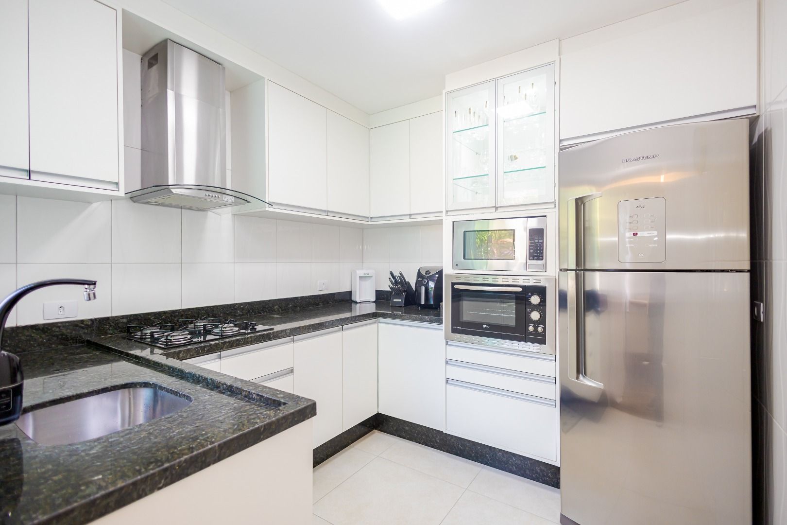 A area de serviço fica no nivel da garagem (subsolo), com um amplo espaço gourmet privativo com churrasqueira.