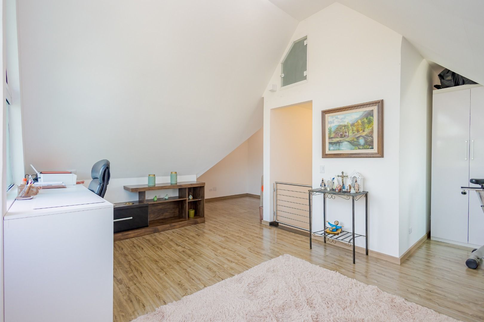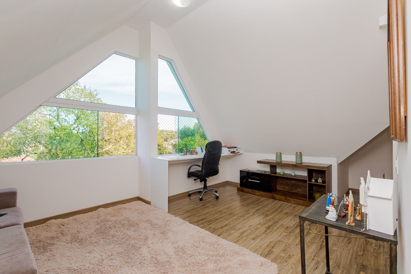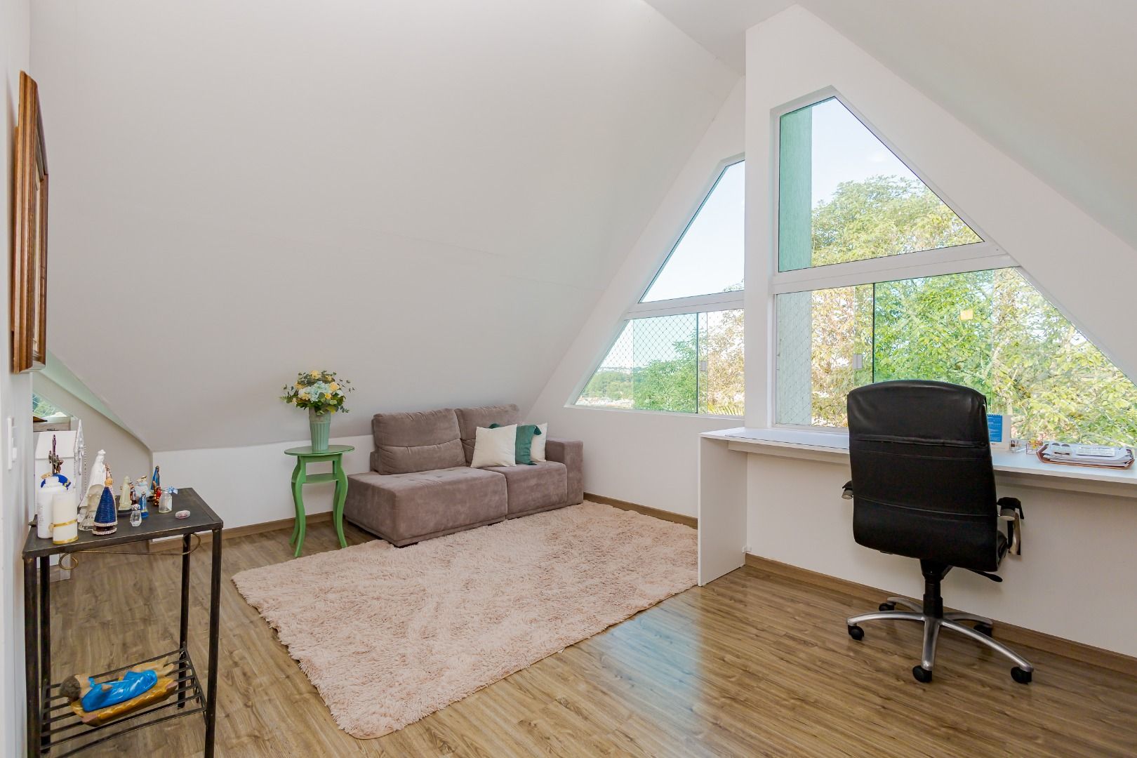 No terceiro andar um atico bem generoso dispondo de uma sala ampla e/ou espaço para escritorio.