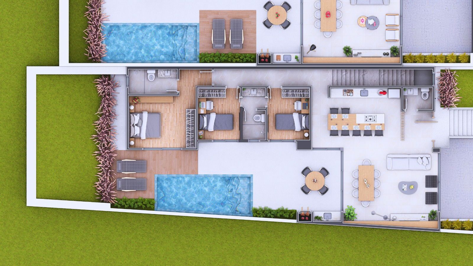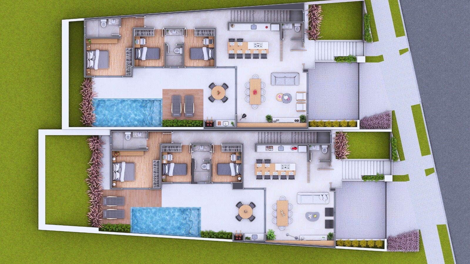 Excelente opção para as famílias que procuram espaço e modernidade mas sem as escadas de uma casa duplex ou triplex. O projeto original contempla duas casas térreas, de frente para a rua, compondo o condomínio Twin Houses.