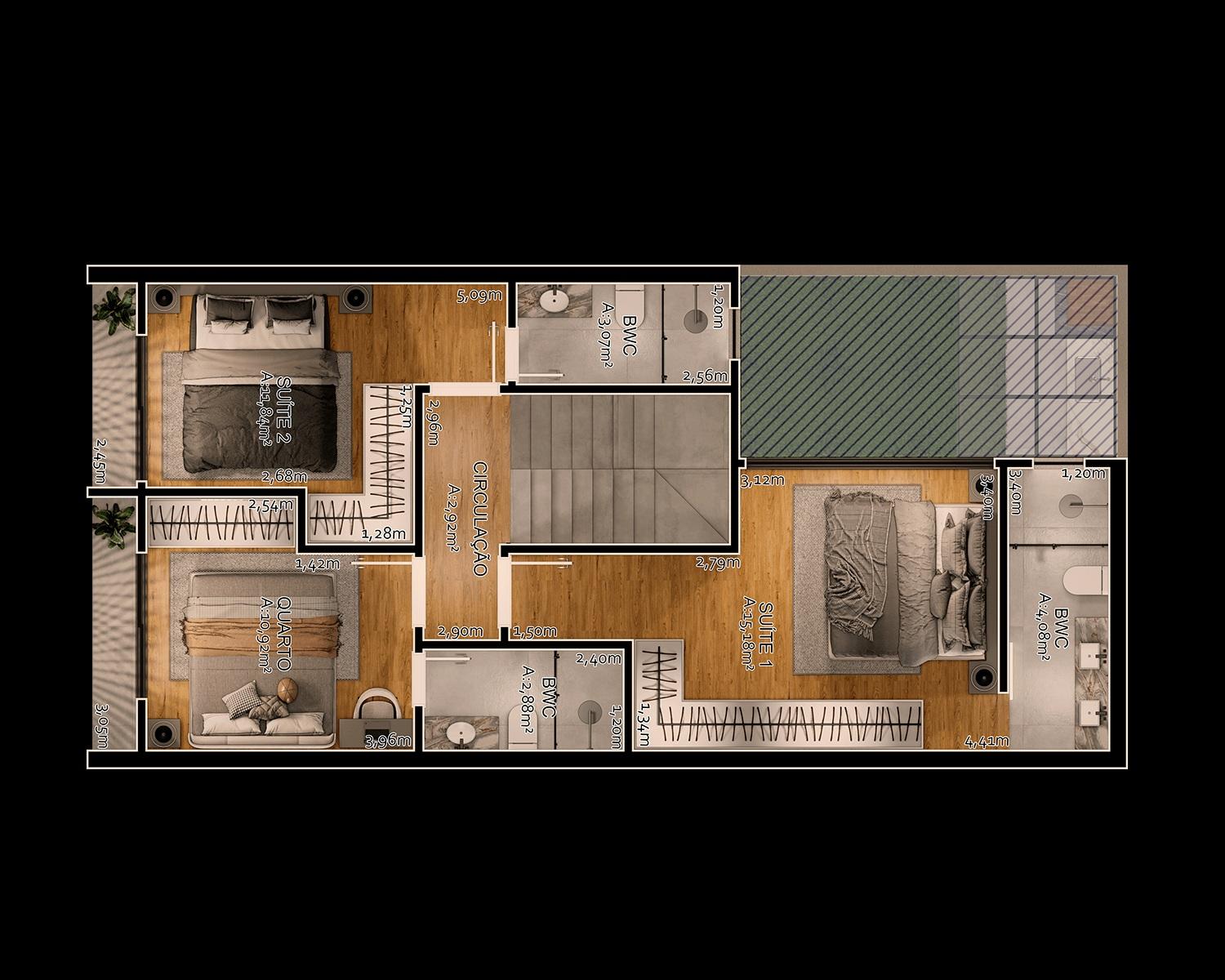 No piso superior, são 3 suites.