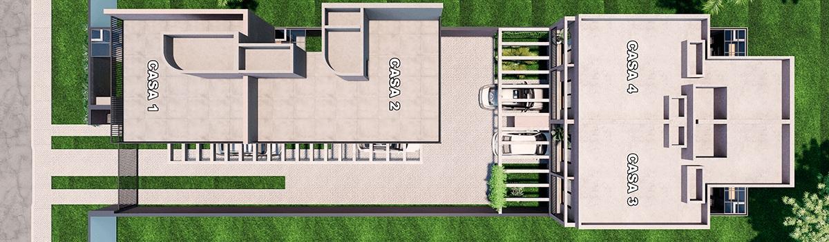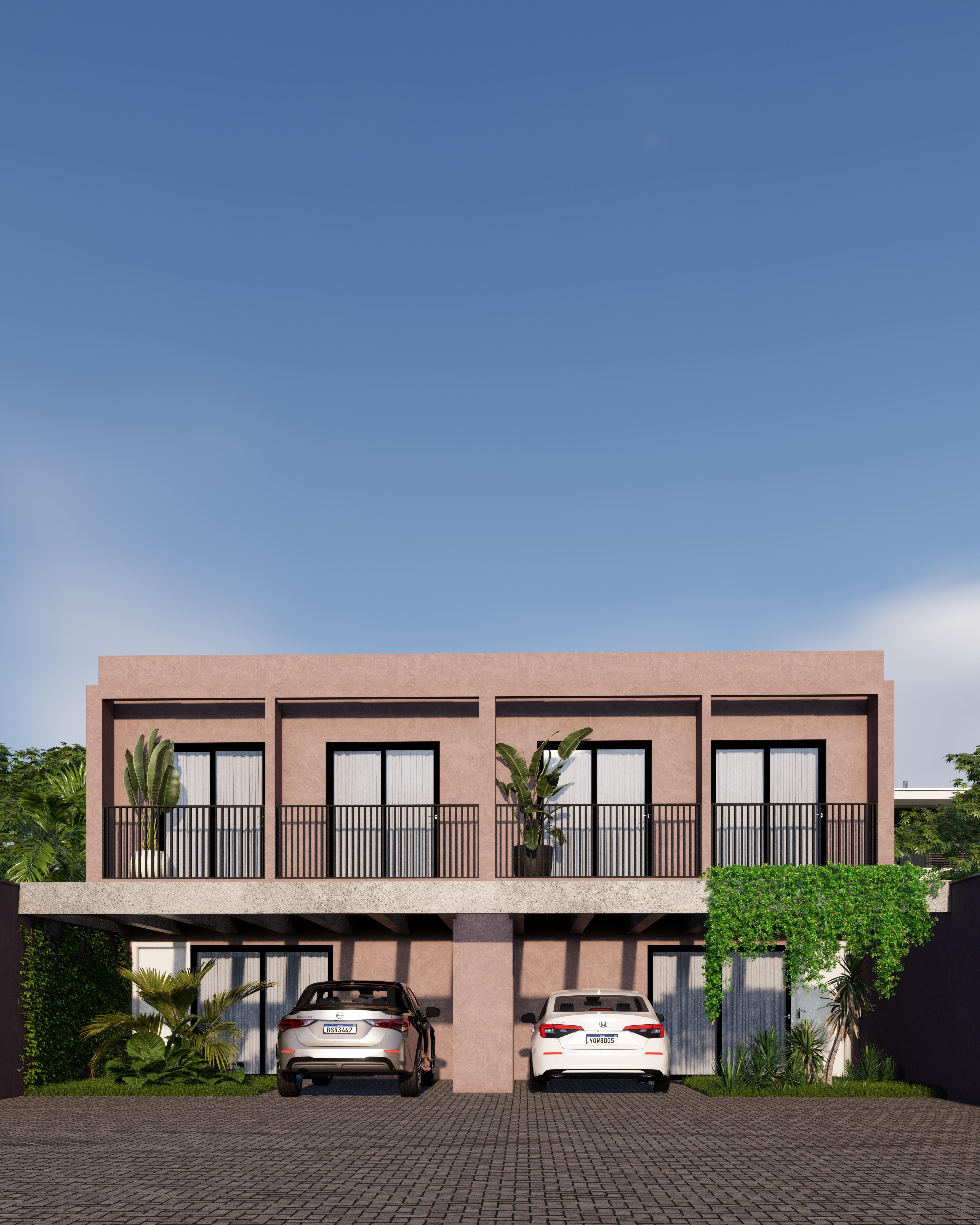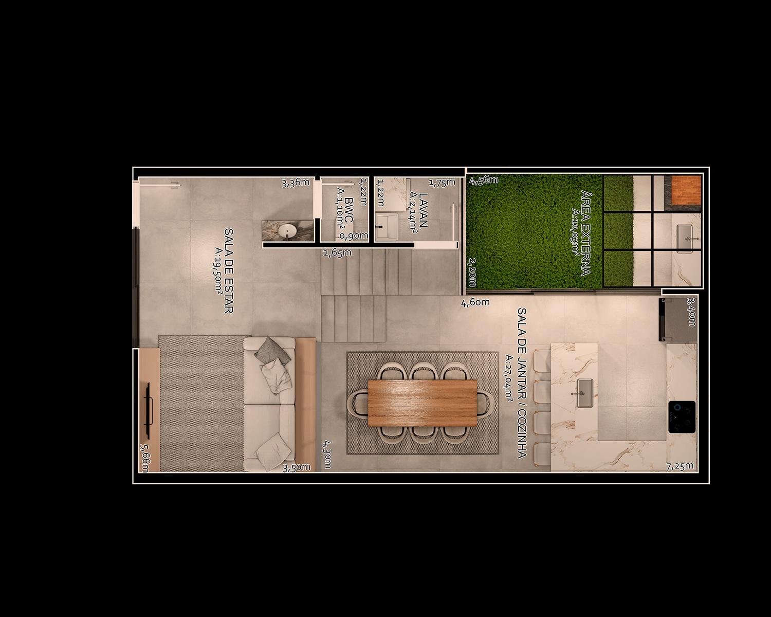 No piso térreo temos sala e cozinha integrados, lavabo, lavanderia e vaga para dois veículos.