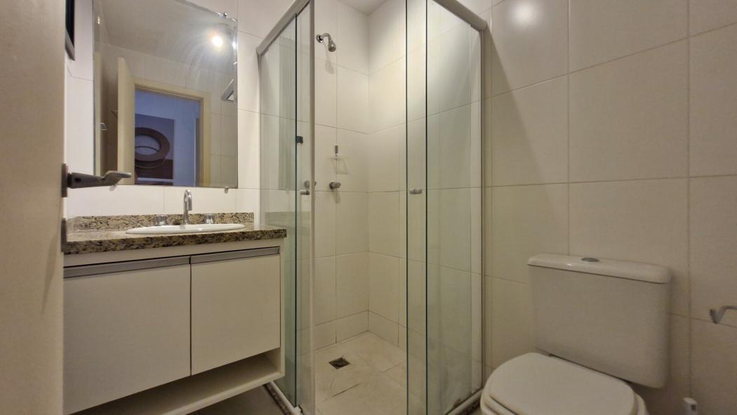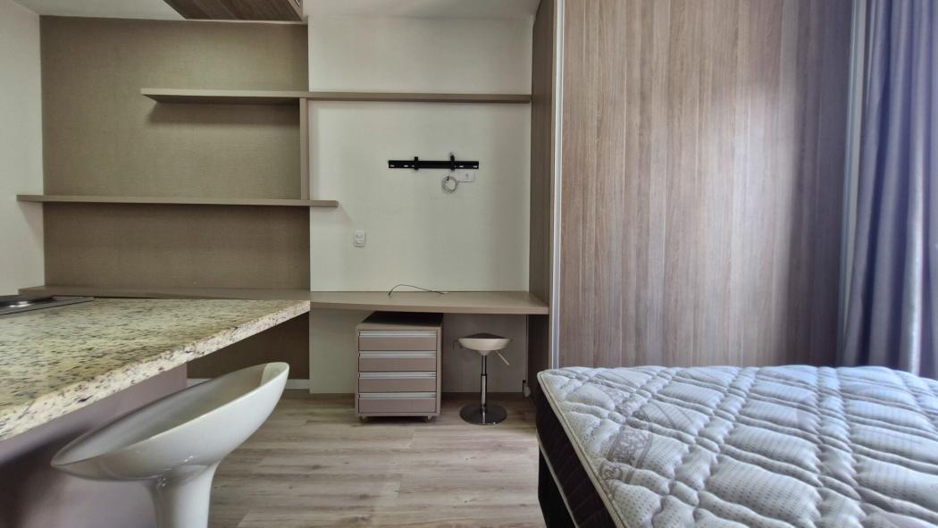 A cozinha é equipada com móveis planejados e cooktop elétrico de 2 bocas. O ambiente de sala/quarto conta com bancada para refeições, com duas banquetas, painel para TV e armário planejado. O banheiro dispõe de armário embutido, espelho e box de vidro.