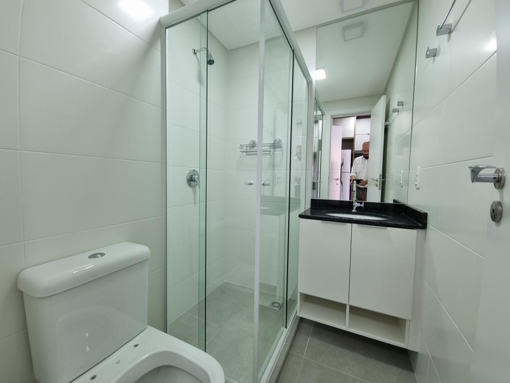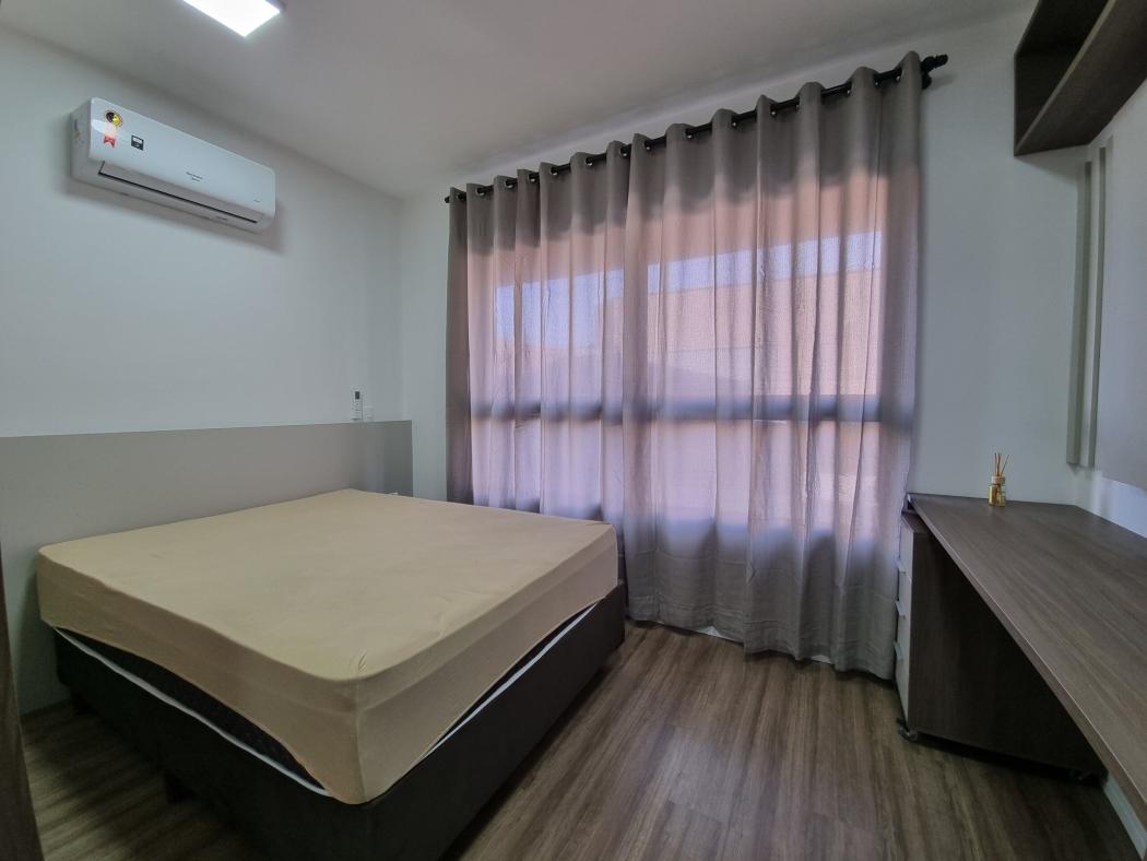 O apartamento conta com cama, armários planejados, bancada de estudos, cozinha compacta equipada e ar-condicionado, além de banheiro com box em vidro. Um espaço inteligente, bem distribuído e pronto para morar.