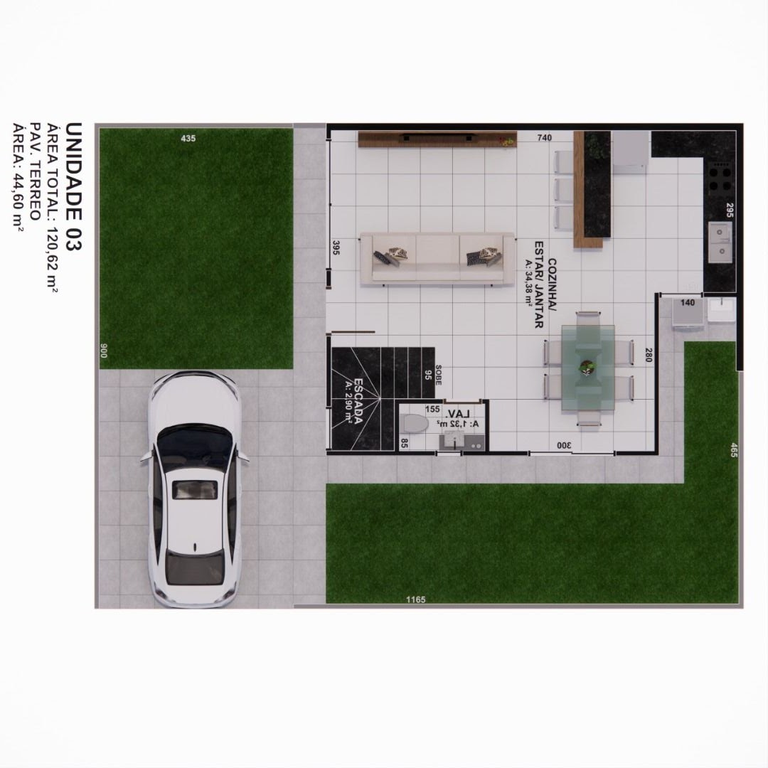 Piso térreo: - Sala para 2 ambientes e cozinha integrada em conceito aberto, Lavabo; Lavanderia; 2 vagas de garagem;