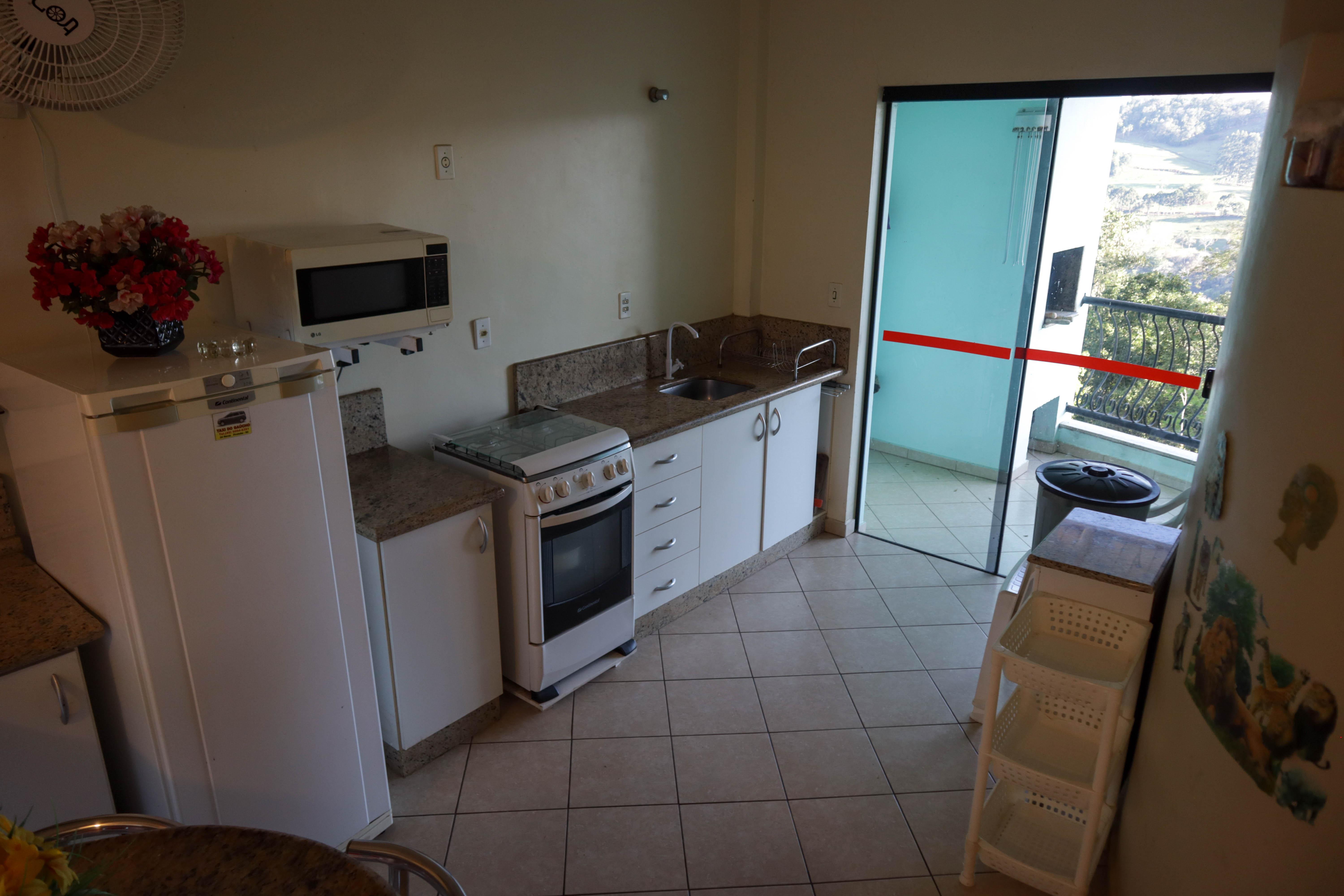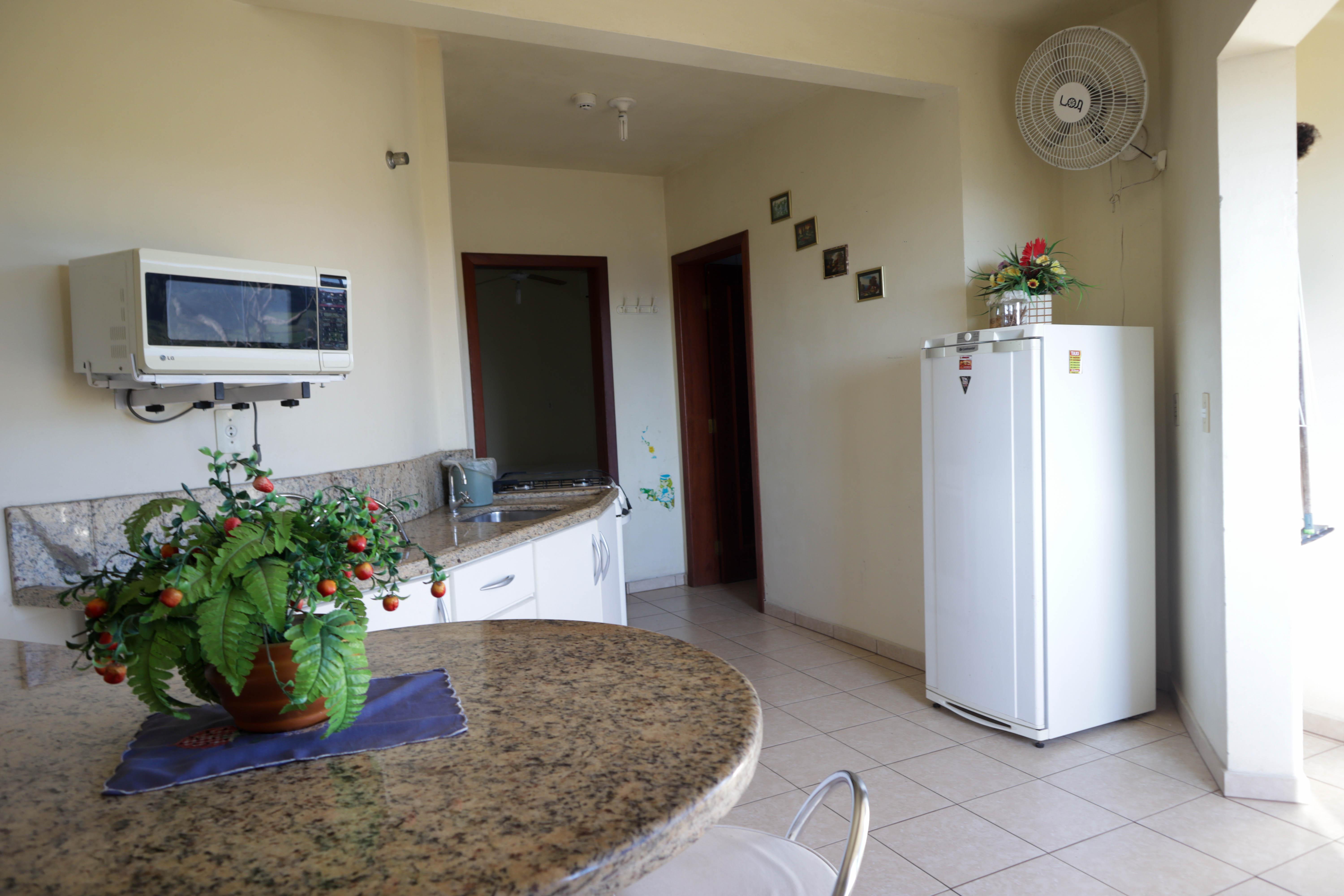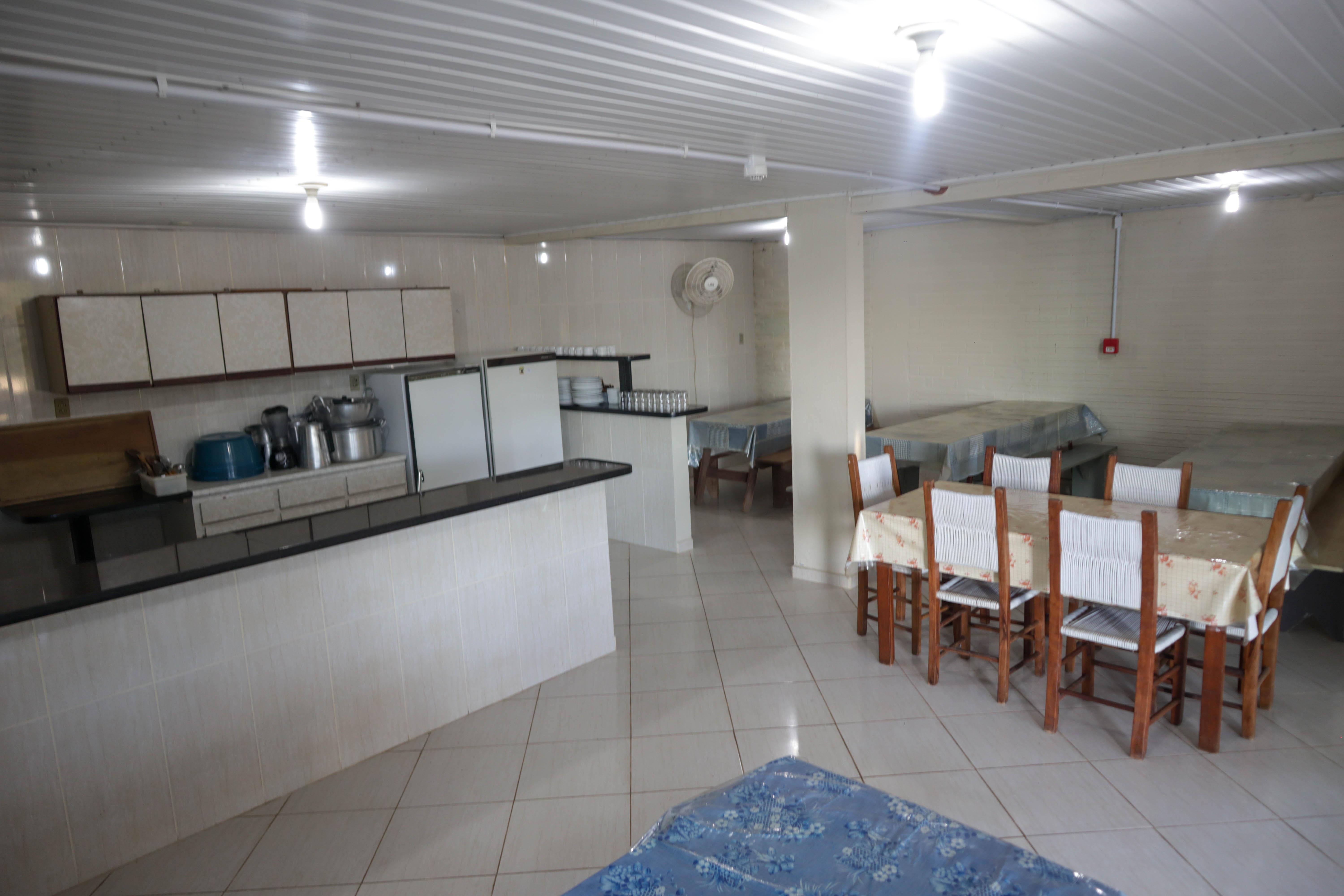 No andar térreo possui uma mini cozinha com fogão industrial, geladeira, freezer, utensílios para acomodação de até 50 pessoas e uma churrasqueira que é de uso coletivo.