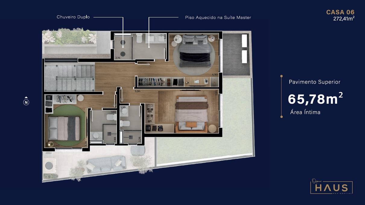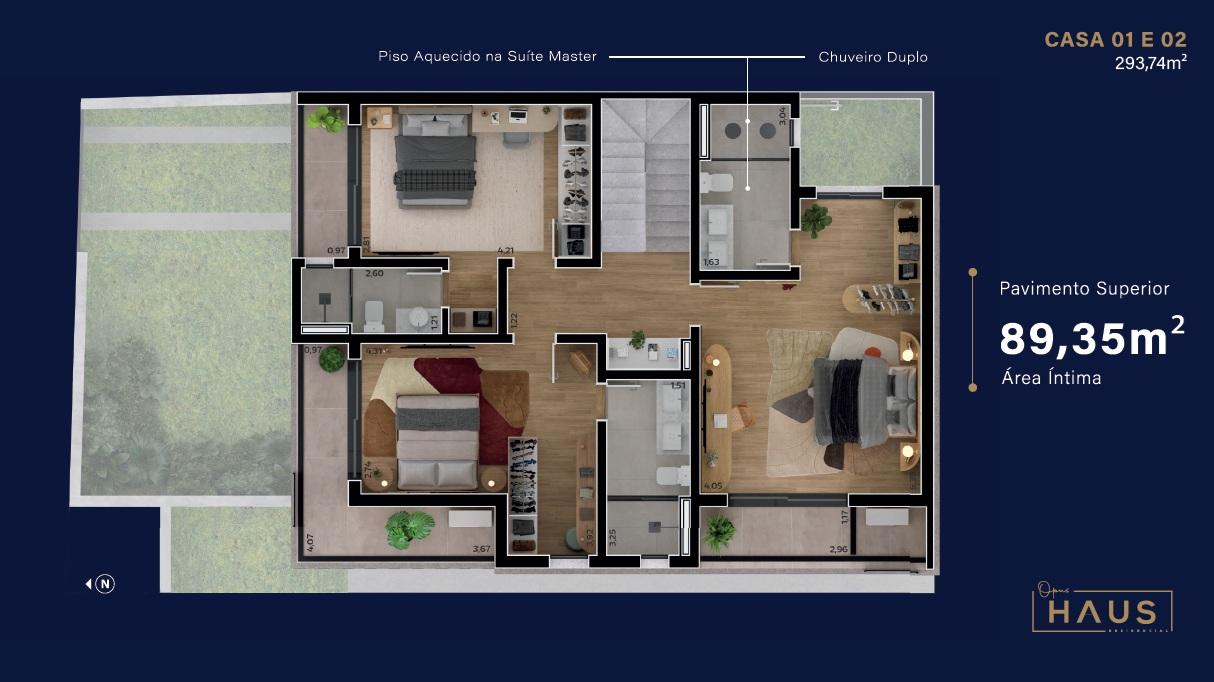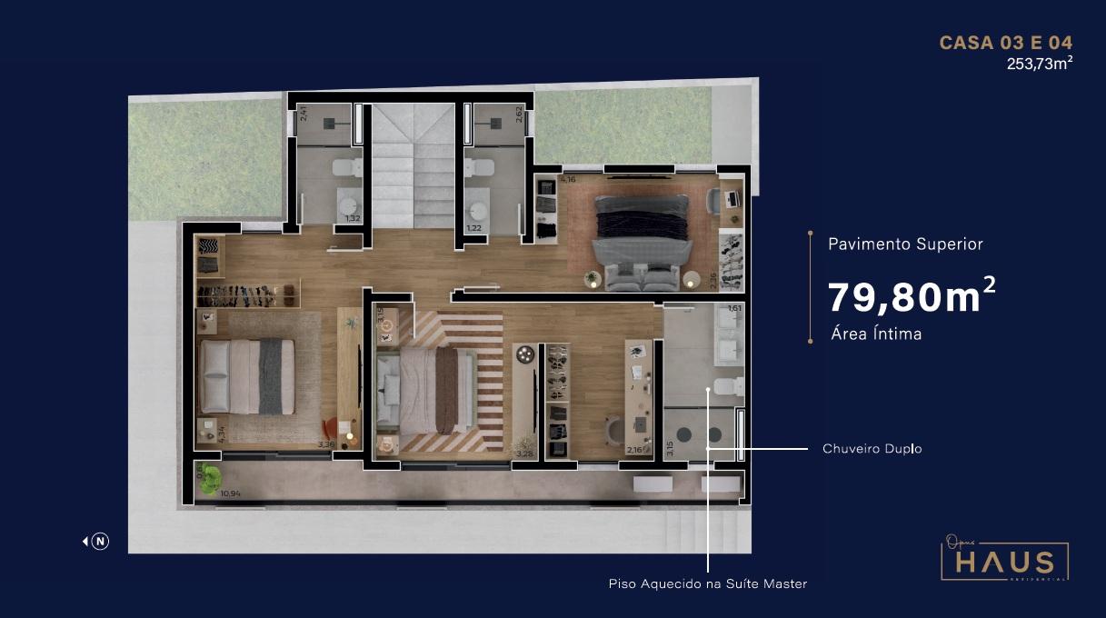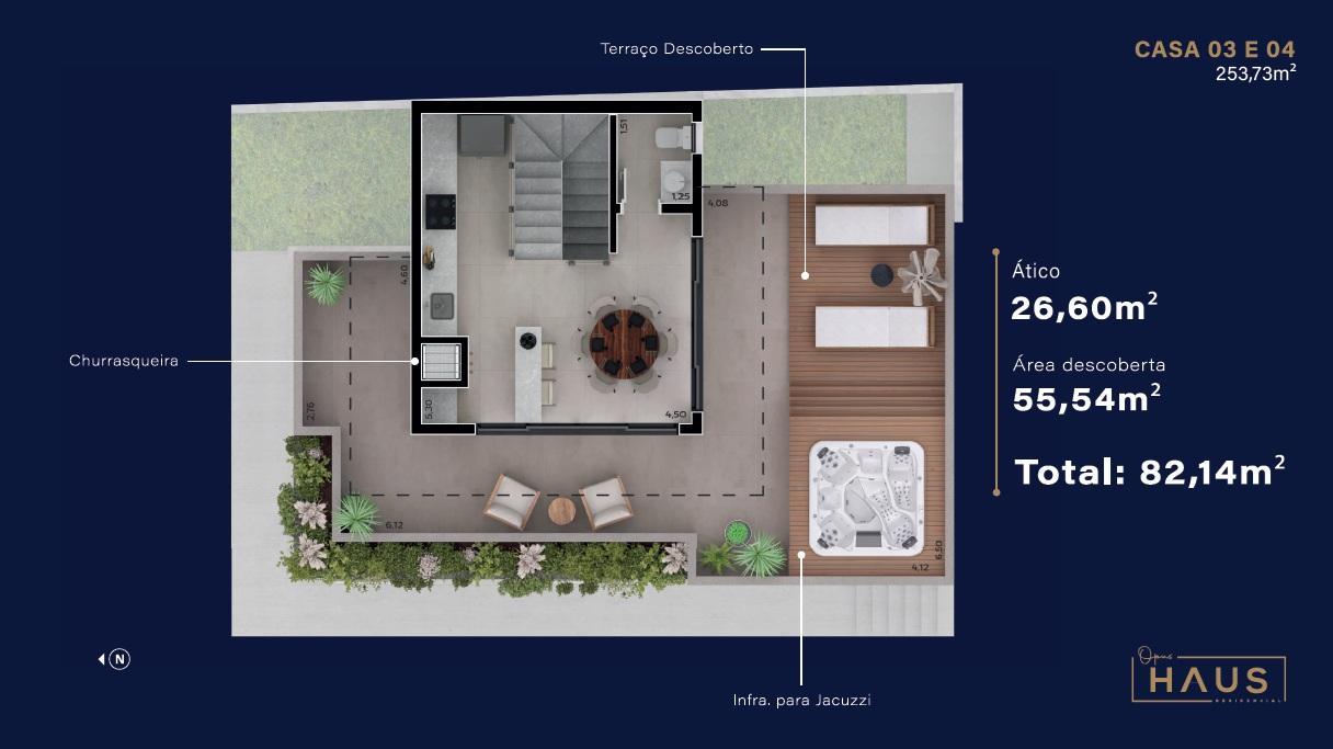 Destaques: sistema de reaproveitamento de água; infra para painel solar; infra para carro elétrico; infra para jacuzzi; piso aquecido na suite master; terraço descoberto; acabamento em gesso; infra para ar condicionado; churrasqueira; closet na suite master e localização em rua sem saída, com mais segurança e privacidade.